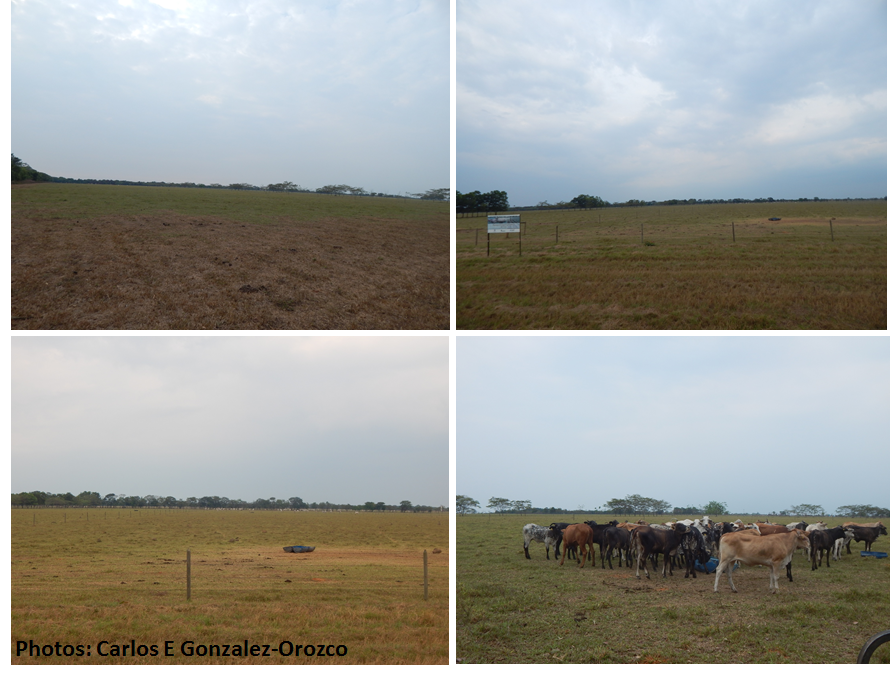 Corpoica and CIAT have been developing an integrative livestock research initiative in Carimagua, Meta (see site description) since 2011. The livestock management research integrates animal and agricultural systems with the aim of improving sustainability and competitiveness of forage-based livestock production in the Colombian savannas. The rotational grazing experiment is taking place in an area of 70 hectares which is sub-divided into 27 paddocks that can have areas between 1.4 to 2.8 hectares. There are also areas (2.8 hectares) established with trees such as Piptadenia opacifolia, Cassia grandis y Acacia mangium. There are 35 commercial Cebu cattle (inter-breed with BON type bulls) involved in the testing of the pastures rotational practices. The grazing rotation practices are carried out on two paddocks: The first one only has Brachiaria dictyoneura (Control) and the second one adds supplements to the Brachiaria dictyoneura (refer to it as treatment 1). The livestock is rotated every six days among paddocks. The animal variables assessed as part of the production and management measurements are productivity (number of animals per hectare), reproduction rate, health condition, parasites management.   The main pasture management practices involve fertilization and tillage as well as silage production from crops (rice, corn, soybean, and forage sorghum) as a method for restoring pasture lands.