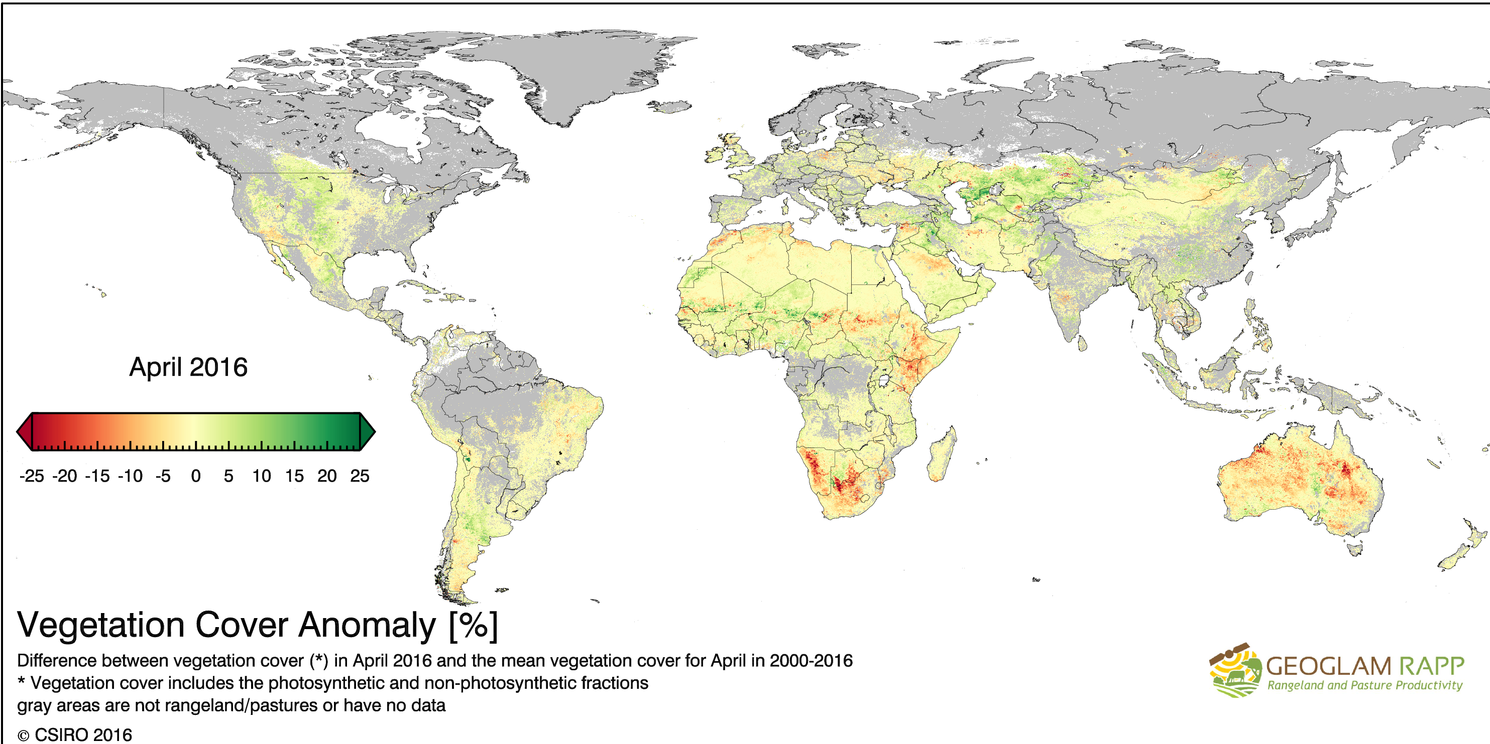 The latest one, April shows lower than average in South Africa, Angola, Botswana, Ethiopia, Kenya, Somalia,and Australia: